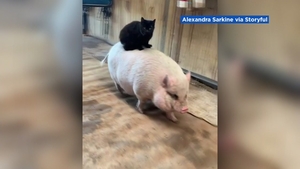 VIDEO: Cat hitches ride on potbellied pig