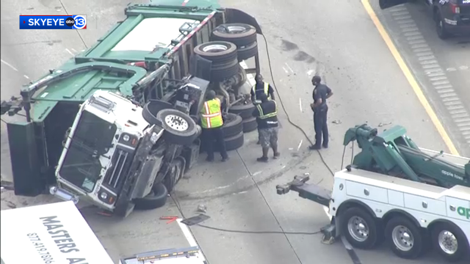 According to the Houston Police Department, the crash happened just before 11 a.m. on Tuesday. Officials said the crash involved an overturned recycling truck in the main lanes.