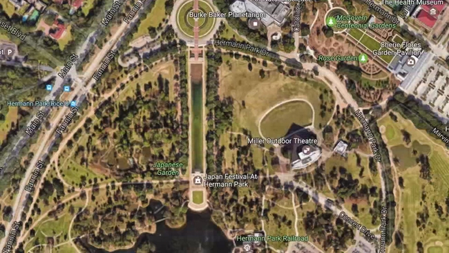 In the trees, a 95 and 96 reveal Houston's longitudes. The column is thought to represent Hermann Park.