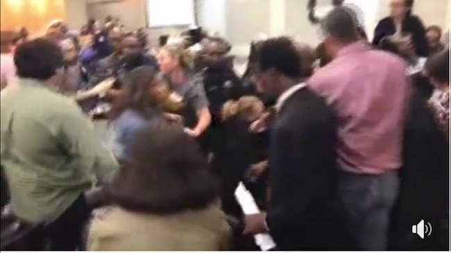 During Tuesday night's workshop, after continuous disruption and multiple outbursts from members of the audience, and after several verbal requests from the Board President to adhere to the rules, attendees were instructed to clear the room and called for a recess. Many refused to leave and a scuffle ensued. An HISD police officer sustained minor injuries."