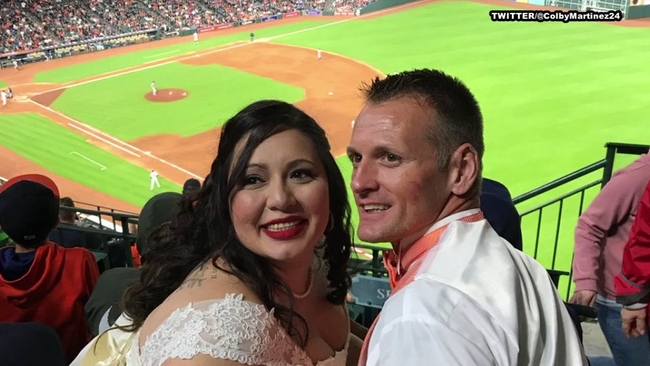 The newlyweds donned their attire -- her wedding dress and his tuxedo -- from the ceremony in Pearland to the Astros game Saturday night.