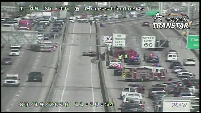 The accident occurred on the northbound lanes near Crosstimbers just before 11 a.m. Monday. Traffic was backed up in the area as northbound freeway lanes were affected as well.
